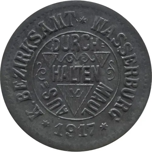 | Obverse lettering | K.BEZIRKSAMT ✶ WASSERBURG AUS DURCH MAUL HALTEN ✶ 1917 ✶ |