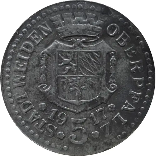 | Obverse lettering | STADT WEIDEN OBERPFALZ ✿ 1917 ✿ ✿ 5 ✿ |