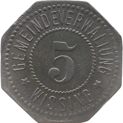 | Obverse lettering | GEMEINDEVERWALTUNG 5 ★ WISSING ★ |