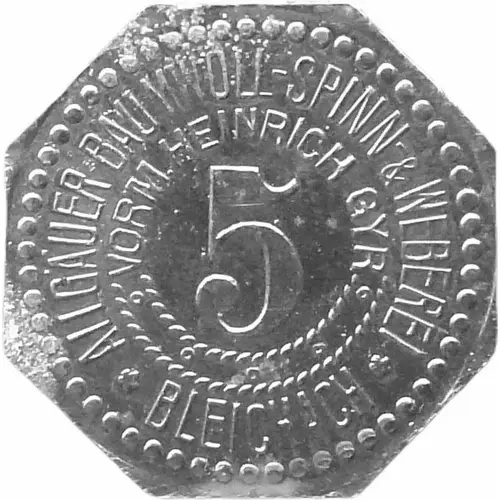 | Obverse lettering | ALLGÄUER BAUMWOLL-SPINN-& WEBEREI VORM. HEINRICH GYR 5 BLEICHACH |