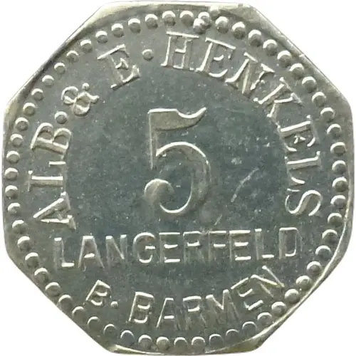 Historical Context: This 5 Pfennigs coin from Langerfeld, issued by Alb. and E. Henkels, exemplifies German Notgeld, or emergency money, likely circulated during or immediately after World War I. Severe metal shortages and economic instability then caused a critical lack of official small change. Municipalities, businesses, and even private entities issued substitute currency for local commerce. Langerfeld, now part of Wuppertal, faced these challenges, and this issue by Alb. and E. Henkels, presumably a local firm, highlights the pragmatic, decentralized solutions adopted across Germany to maintain local economic function.