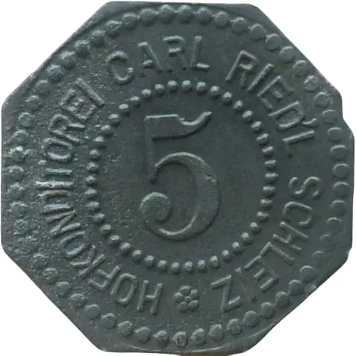 | Obverse lettering | HOFKONDITOREI CARL RIED`L SCHLEIZ 5 ✿ |