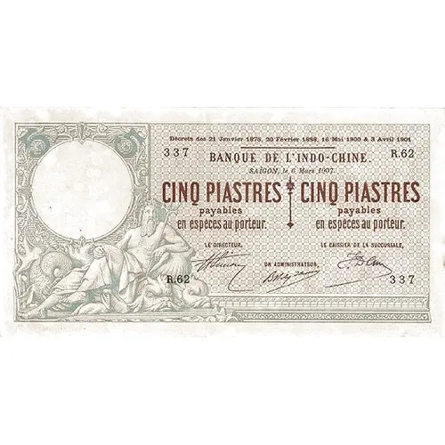 DÉCRETS DES 21 JANVIER 1875, 20 FÉEVRIER 1888, 16 MAI 1900 & 3 AVRIL 1901 BANQUE DE L`INDO-CHINE SAIGON CINQ PIASTRES PAYABES EN ESPÉCES AU PORTEUR |