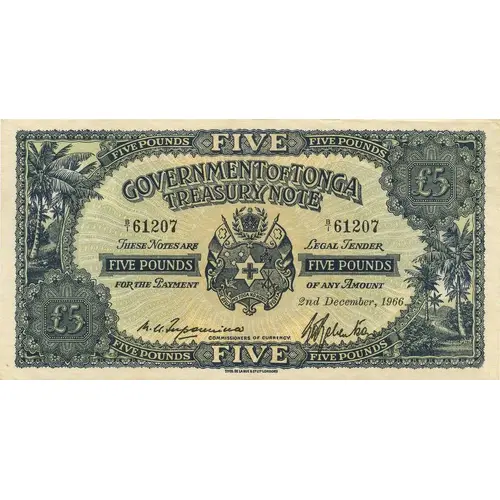 £5 FIVE Government of Tonga Treasury Note These notes are legal tender FIVE POUNDS For the payment of any amount Five Pounds Sterling on demand at the Treasury 2nd. December, 1966. FIVE Thomas de la Rue, London |