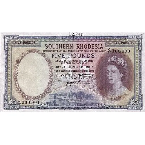 SOUTHERN RHODESIA CURRENCY NOTES ARE LEGAL TENDER FOR THE PAYMENT OF ANY AMOUNT FIVE POUNDS ISSUED IN TERMS OF THE COINAGE AND CURRENCY ACT 1938 FOR THE SOUTHERN THODESIA CURRENCY BOARD |
