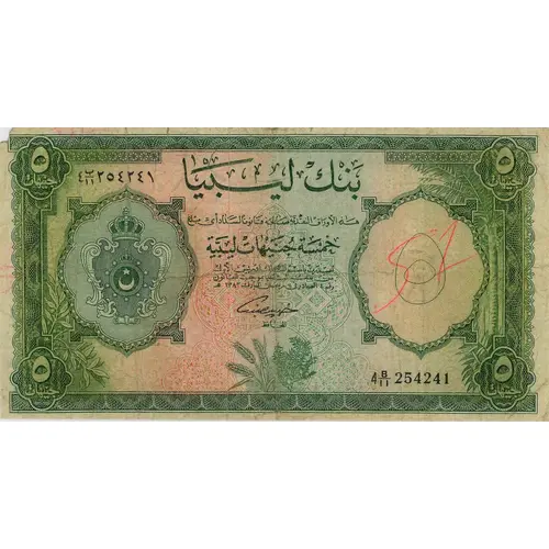 | 表面の銘文 | NATIONAL BANK OF LIBYA THESE CURRENCY NOTES ARE LEGAL TENDER FOR THE PAYMENT OF ANY AMOUNT FIVE LIBYAN POUNDS ISSUED IN THE NAME OF KING IDRIS I BY THE NATIONAL BANK OF LIBYA IN ACCORDANCE WITH THE LAW OF THE 26TH APRIL 1955 |