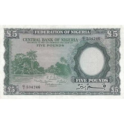 | Obverse lettering | Federation of Nigeria Central Bank of Nigeria Promise to pay on demand the sum of Five Pounds |