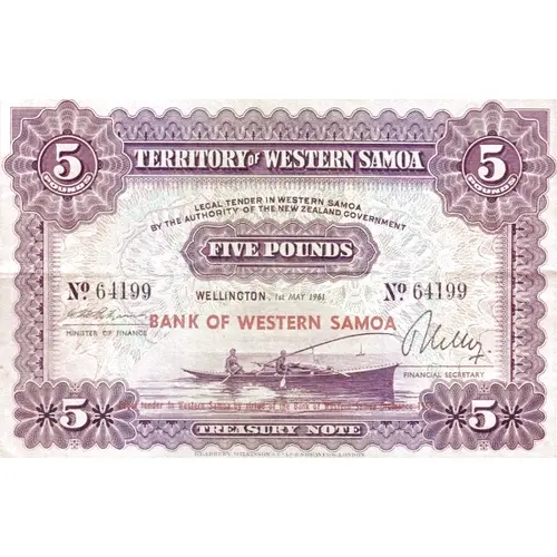 | 表面の銘文 | TERRITORY OF WESTERN SAMOA LEGAL TENDER IN WESTERN SAMOA BY THE AUTHORITY OF THE NEW ZEALAND GOVERNMENT FIVE POUNDS BANK OF WESTERN SAMOA Legal tender in Western Samoa by virtue of the Bank of Western Samoa Ordinance 1959 TREASURY NOTE |