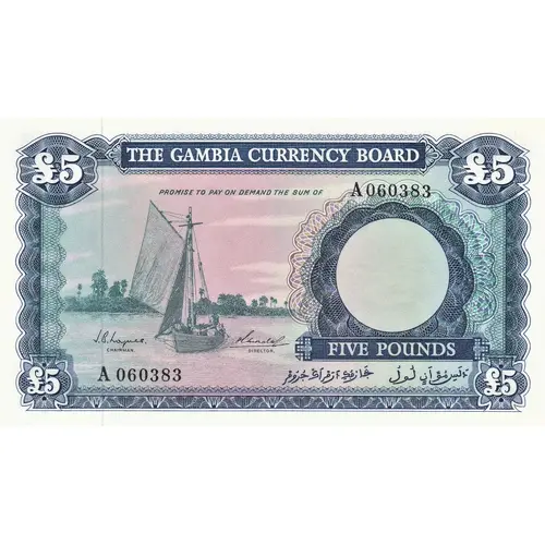 Obverse lettering The Gambia Currency Board Promise to pay on demand the sum of Five Pounds