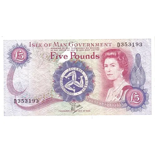 Obverse lettering Isle of Man Government Promise to pay the bearer on demand at any office of the Isle of Man Bank Limited Five Pounds