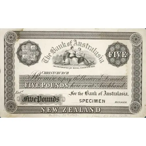 | Obverse lettering | FIVE THE BANK OF AUSTRALASIA INCORPORATED BY ROYAL CHARTER, 1835. CHRISTCHURCH PROMISE TO PAY THE BEARER IN DEMAND FIVE POUNDS, HERE OR AT AUCKLAND FOR THE BANK OF AUSTRALASIA FIVE POUNDS NEW ZEALAND |