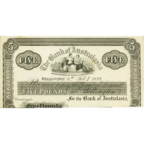 FIVE FIVE THE BANK OF AUSTRALASIA INCORPORATED BY ROYAL CHARTER 1835 WELLINGTON PROMISE TO PAY THE BEARER ON DEMAND FIVE POUNDS AT WELLINGTON FOR THE BANK OF AUSTRALASIA NEW ZEALAND NEW ZEALAND FIVE POUNDS |