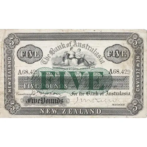 | Obverse lettering | FIVE FIVE THE BANK OF AUSTRALASIA INCORPORATED BY ROYAL CHARTER 1835 WELLINGTON PROMISE TO PAY THE BEARER IN DEMAND FIVE POUNDS AT WELLINGTON FOR THE BANK OF AUSTRALASIA FIVE POUNDS NEW ZEALAND |