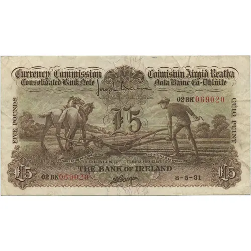 | Obverse lettering | Currency Commission Consolidated Bank Note Coimisiún Airgid Reatha Nóta Bainc Có-Dhlúite Five Pounds Cúig Puint Payable at the Principle Office in Dublin of Tá so iníoctha ag an bPríomh-Oifig i mBaile Átha Cliath de The Bank of Ireland |
