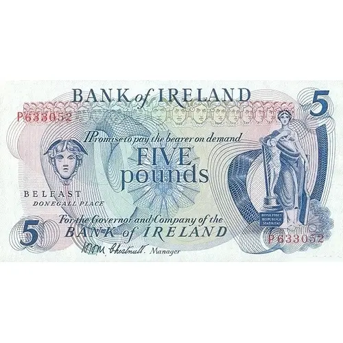 | Obverse lettering | Bank of Ireland I Promise to pay the bearer on demand Five Pounds For the Governor and Company of the Bank of Ireland |