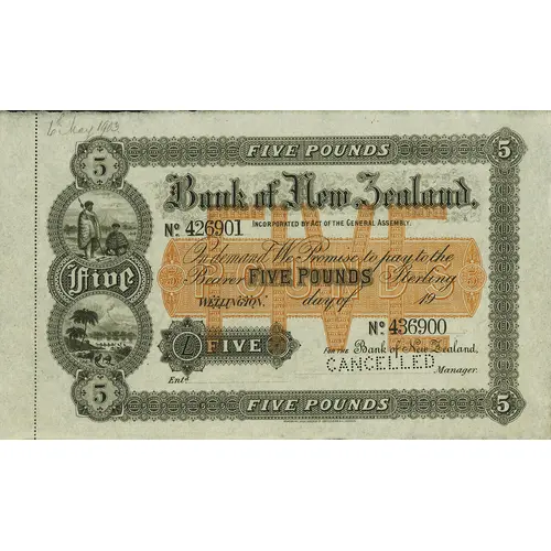 | 正面铭文 | FIVE POUNDS BANK OF NEW ZEALAND INCORPORATED NY THE ACT OF GENERAL ASSEMBLY FIVE ON DEMAND WE PROMISE TO PAY TO THE BEARER FIVE POUNDS STERLING WELLINGTON DAY OF... FIVE FOR THE BANK OF NEW ZEALAND FIVE POUNDS |