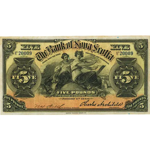 | Obverse lettering | FIVE FIVE THE BANK OF NOVA SCOTIA WILL PAY TO THE BEARER ON DEMAND FIVE POUNDS AT ITS BRANCH IN KINGSTON JAMAICA FOR GENERAL MANAGER FIVE POUNDS FIVE POUNDS |