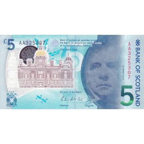 £5 Bank of Scotland plc promises to pay the Bearer on demand five pounds sterling at its registered office, Edinburgh Sir Walter Scott Bank of Scotland |