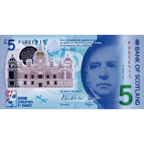 Pudsey 15 Bank of Scotland plc promises to pay the Bearer on demand five pounds sterling at its registered office, Edinburgh Sir Walter Scott Bank of Scotland BBC Children in Need |