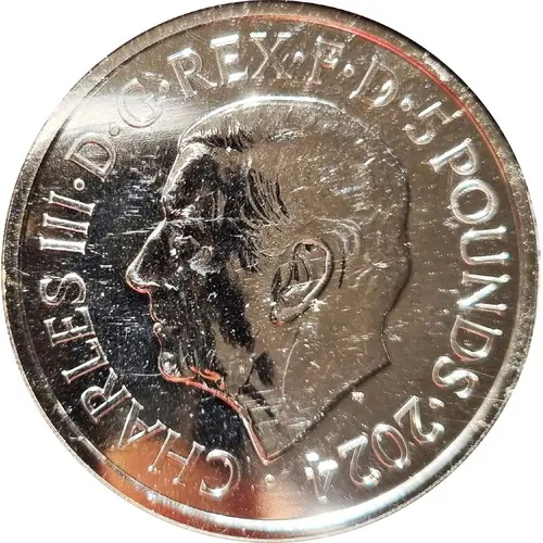 | Надписи аверса | CHARLES III·D·G·REX·F·D·5 POUNDS·2024 · MJ (Translation: Charles the Third by the Grace of God King Defender of the Faith) |