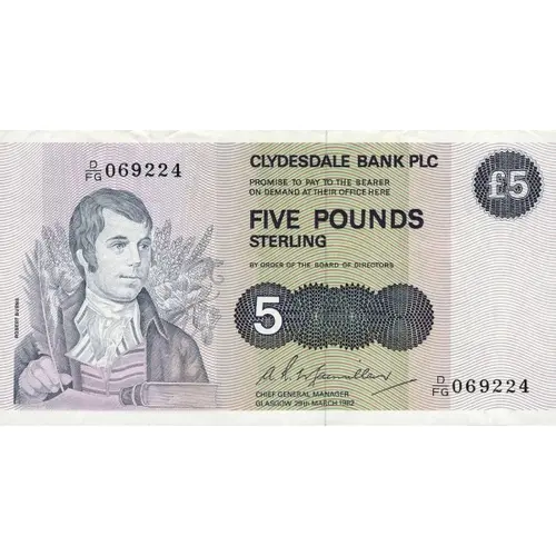 | Leyenda del anverso | Clydesdale Bank PLC Promise to pay to the bearer on demand at their office here Five Pounds Sterling By order of the Board of Directors |