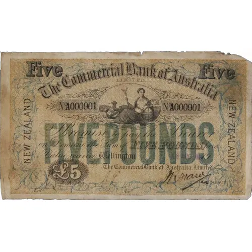| Obverse lettering | FIVE FIVE THE COMMERCIAL BANK OF AUSTRALIA LIMITED PROMISE TO PAY THE BEARER ON DEMAND THE SUM OF FIVE POUNDS HERE VALUE RECEIVED WELLINGTON NEW ZEALAND NEW ZEALAND THE COMMERCIAL BANK OF AUSTRALIA LIMITED |
