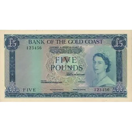 ₤ 5 BANK OF THE GOLD COAST THIS NOTE IS ISSUED ON BEHALF OF THE GOVERNMENT OF THE GOLD COAST AND IS LEGAL TENDER OF THE GOLD COAST FOR THE PAYMENT OF ANY AMOUNT FIVE |
