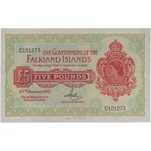 | Obverse lettering | The Government of the Falkland Islands These Notes are Legal Tender for the payment of any amount Five Pounds |