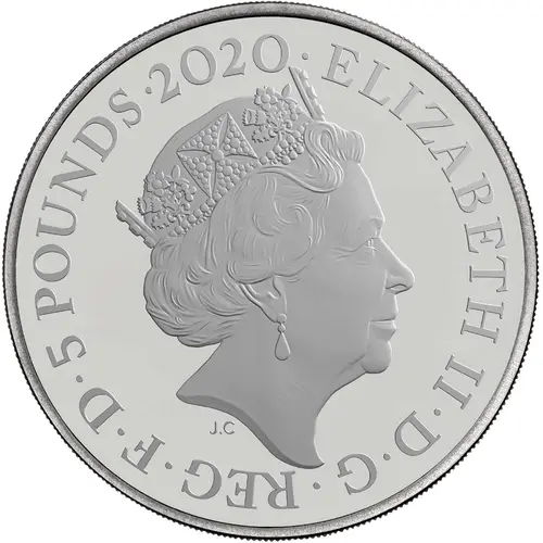 | Obverse lettering | ELIZABETH II·D·G·REG·F·D·5 POUNDS·2020· J.C (Translation: Elizabeth the Second by the Grace of God Queen Defender of the Faith) |