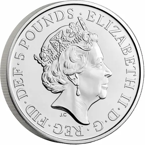 | Obverse lettering | ELIZABETH II·D·G·REG·FID·DEF·5 POUNDS· J.C (Translation: Elizabeth the Second by the Grace of God Queen Defender of the Faith) |