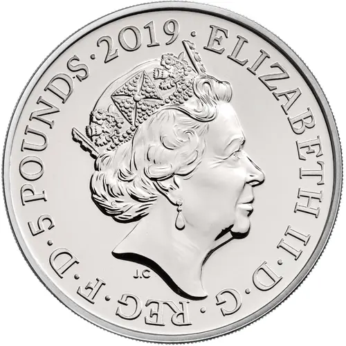 | Obverse lettering | ELIZABETH II·D·G·REG·F·D·5 POUNDS·2019· J.C (Translation: Elizabeth the Second by the Grace of God Queen Defender of the Faith) |