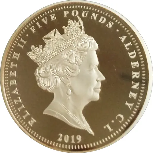 ELIZABETH · II · FIVE POUNDS · ALDERNEY C. I. 2019 |