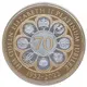 A design with 70 in the centre and arranged around Crown, Orb, and the four national emblems. An outer circle contains the lettering. |