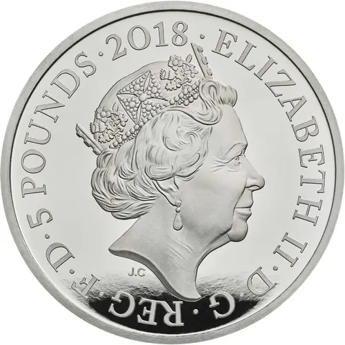 | Obverse lettering | ELIZABETH II·D·G·REG·F·D·5 POUNDS·2018 J.C (Translation: Elizabeth the Second by the Grace of God Queen Defender of the Faith) |