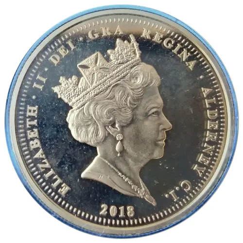 ELIZABETH · II · DEI · GRA REGINA · ALDERNEY C.I. JI 2018 (Translation: Elizabeth II By The Grace of God Queen Alderney, Channel Islands) |
