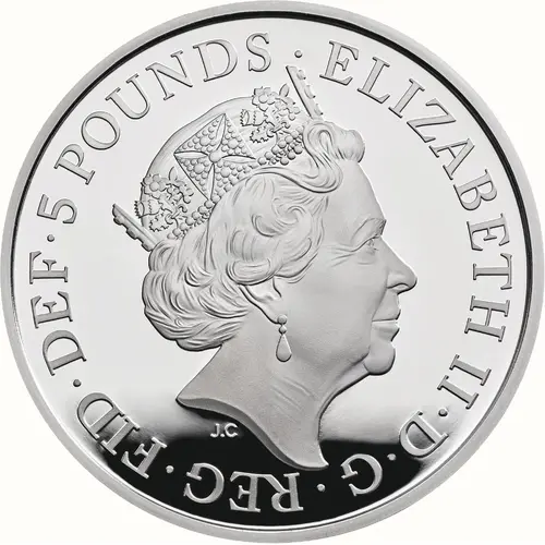 ELIZABETH II·D·G·REG·FID·DEF·5 POUNDS· J.C (Translation: Elizabeth the Second by the Grace of God Queen Defender of the Faith) |