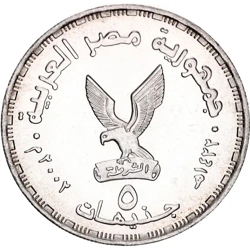 | Obverse lettering | جمهورية مصر العربية ١٤٢٢ ـ ٢٠٠٢ ٥ جنيهات (Translation: Arab Republic of Egypt 2002 - 1422 5 Pounds) |
