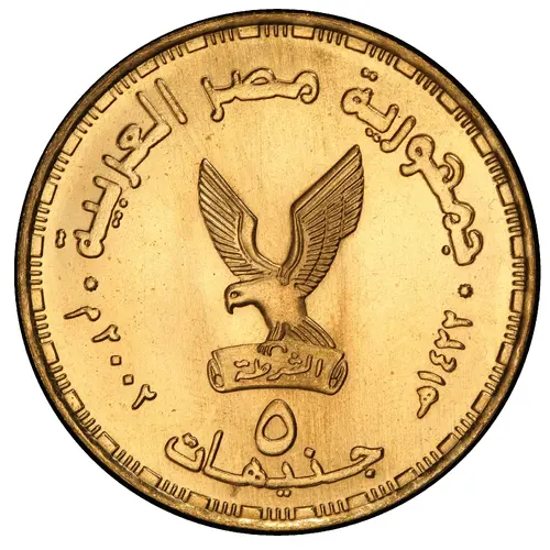 | Obverse lettering | جمهورية مصر العربية ١٤٢٢ ـ ٢٠٠٢ ٥ جنيهات (Translation: Arab Republic of Egypt 2002 - 1422 5 Pounds) |