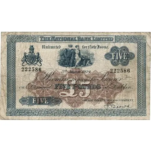 | Obverse lettering | The National Bank Limited Unlimited for Note Issue I Promise to pay the Bearer on Demand Five Pounds at Dublin For the Directors and Company |