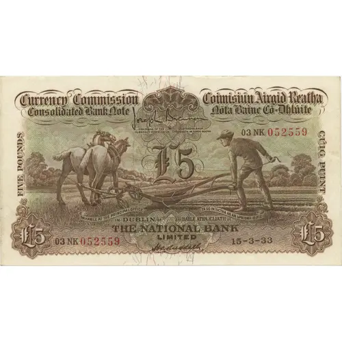 | Obverse lettering | Currency Commission Consolidated Bank Note Coimisiún Airgid Reatha Nóta Bainc Có-Dhlúite Five Pounds Cúig Puint Payable at the Principle Office in Dublin of Tá so iníoctha ag an bPríomh-Oifig i mBaile Átha Cliath de The National Bank Limited |