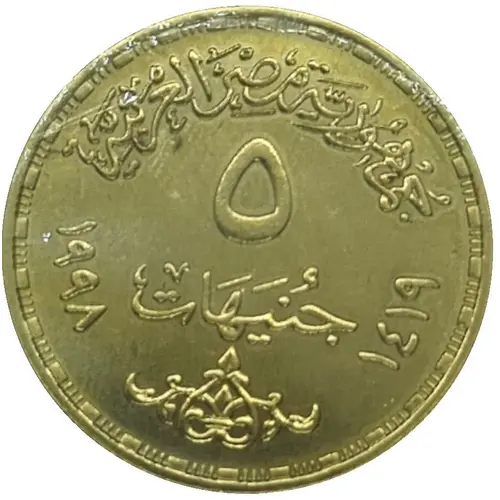 | Obverse lettering | جمهورية مصر العربية ٥ جنيهات ١٤١٩ - ١٩٩٨ (Translation: Arab Republic of Egypt 5 Pounds 1998 - 1419) |