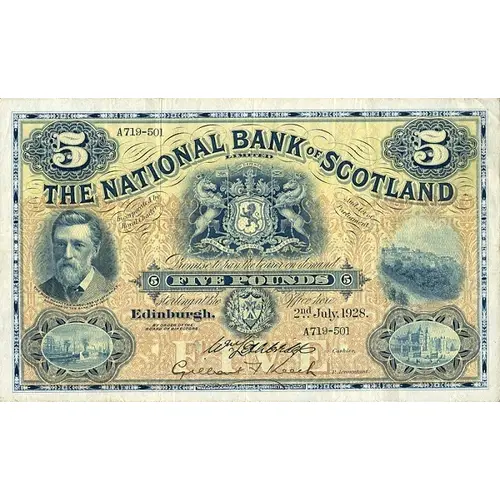 The National Bank of Scotland Limited Incorporated by Royal Charter and Act of Parliament Promise to pay the bearer on demand Five Pounds sterling at the Office here Edinburgh By order of the Board of Directors |