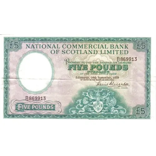 National Commercial Bank of Scotland Limited Promise to pay the bearer on demand Five Pounds Sterling At the Head Office here Edinburgh By order of the Board of Directors |