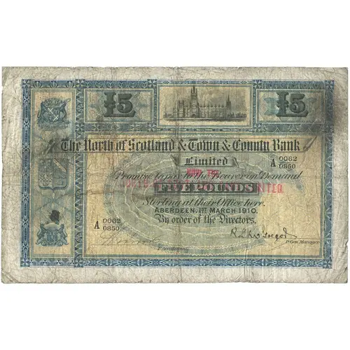 The North of Scotland & Town & County Bank Limited Promise to Pay the Bearer on Demand Five Pounds Sterling at their Office here Aberdeen By order of the Directors NOW THE NORTH OF SCOTLAND BANK LIMITED |