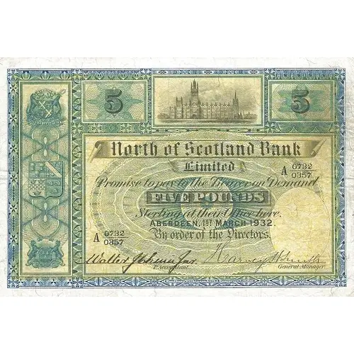 | Obverse lettering | North of Scotland Bank Limited Promise to pay to the Bearer on Demand Five Pounds Sterling at their Office here Aberdeen By order of the Directors |