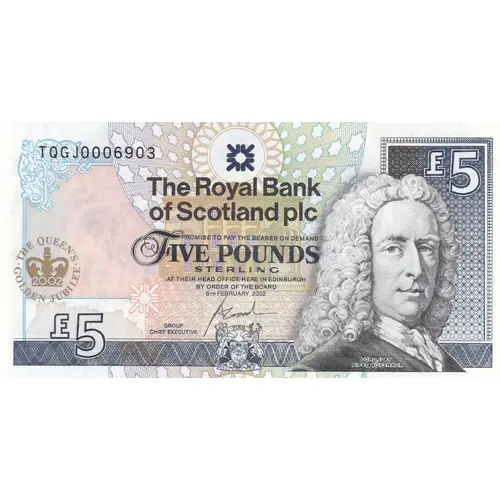 The Royal Bank of Scotland plc Promise to pay the bearer on demand Five Pounds Sterling at their head office here in Edinburgh by order of the Board |