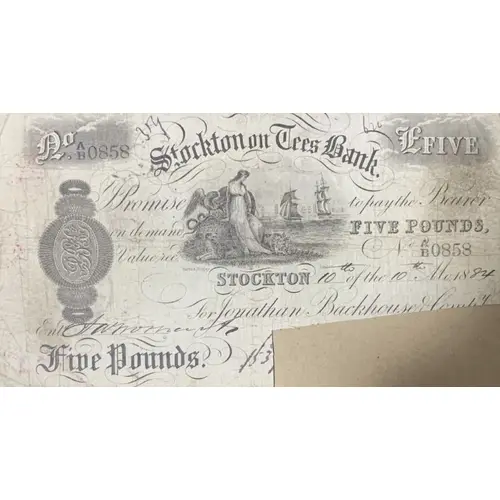 | Obverse lettering | Stockton on Tees Bank. £5. Promise to pay the Bearer FIVE POUNDS STOCKTON For Jonathan Backhouse & Company Entd Five Pounds. |