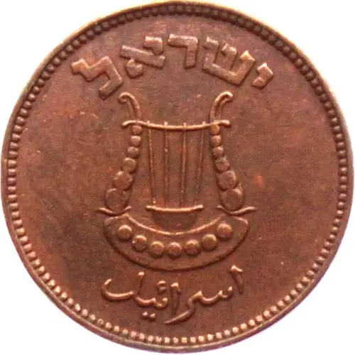 | Obverse description | Four-stringed lyre; `Israel` in Hebrew and Arabic. The design is based off of a coin from the Bar-Kochba Revolt (132-135CE). |