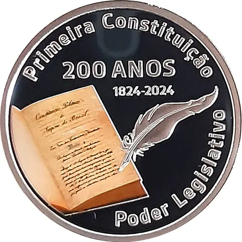 | Obverse lettering | Open book of the first constitution, with a manuscript sepia-colored page and a pen. “Primeira Constituição” [First Constitution], “Poder Legislativo” [Legislative Power], “200 ANOS” [200 YEARS] and “1824-2024”. |