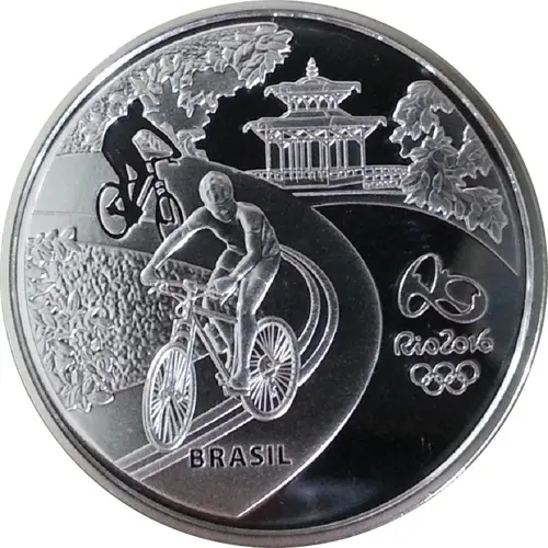 | Obverse description | Scene depicting the practice of cycling in the Tijuca Forest, with the Chinese View on the background. Complete the composition the mark of the Rio 2016 Games and the legend `Brasil`. |